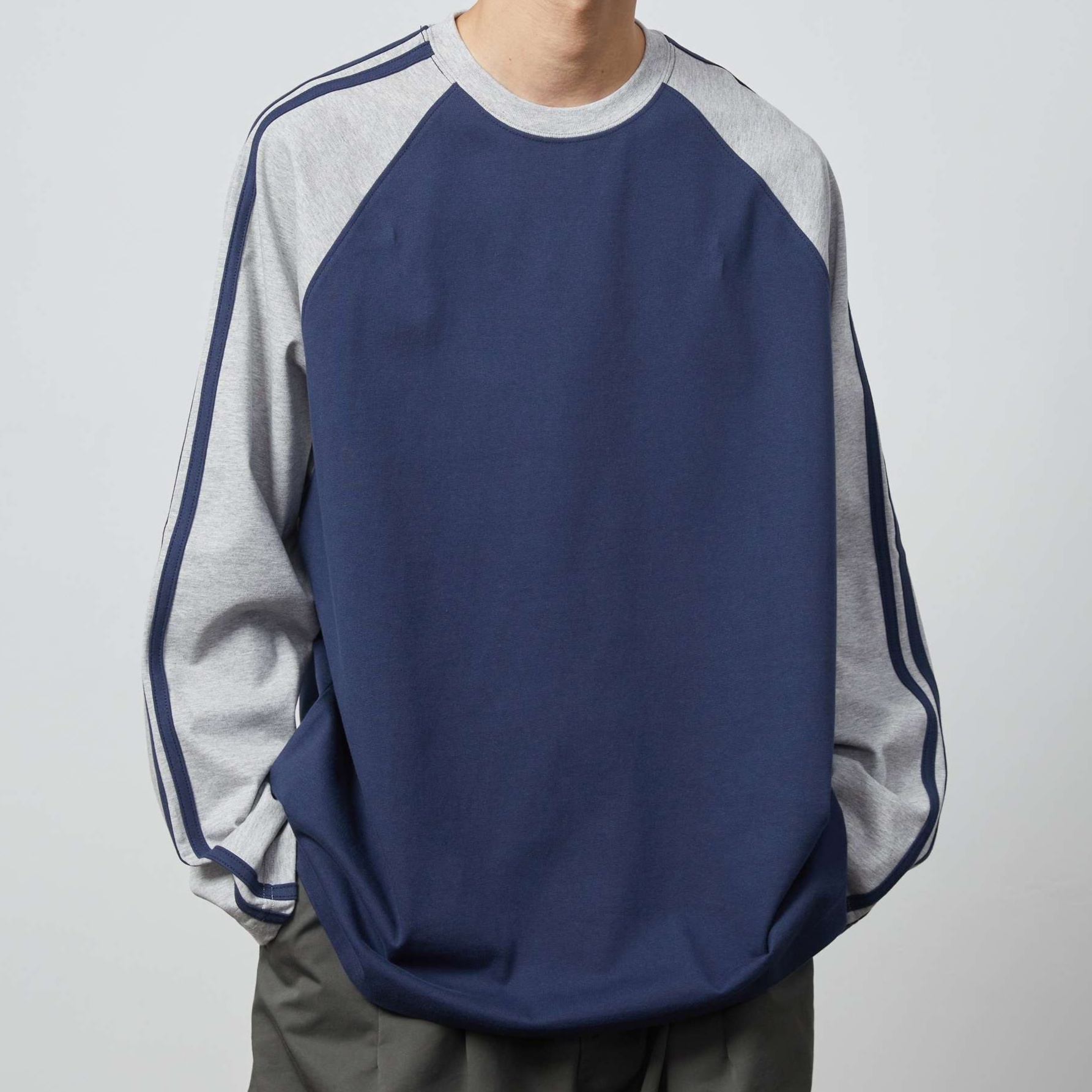 ネイビーの本体に対して、グレーの袖がアクセントとなり、さらに袖のラインがスポーティさを強調しています。