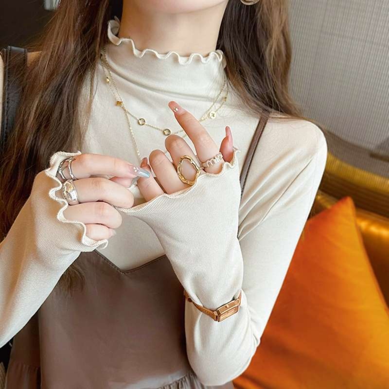 ニット素材の柔らかな質感とフリルの甘さが絶妙なバランスを生み出しています。
