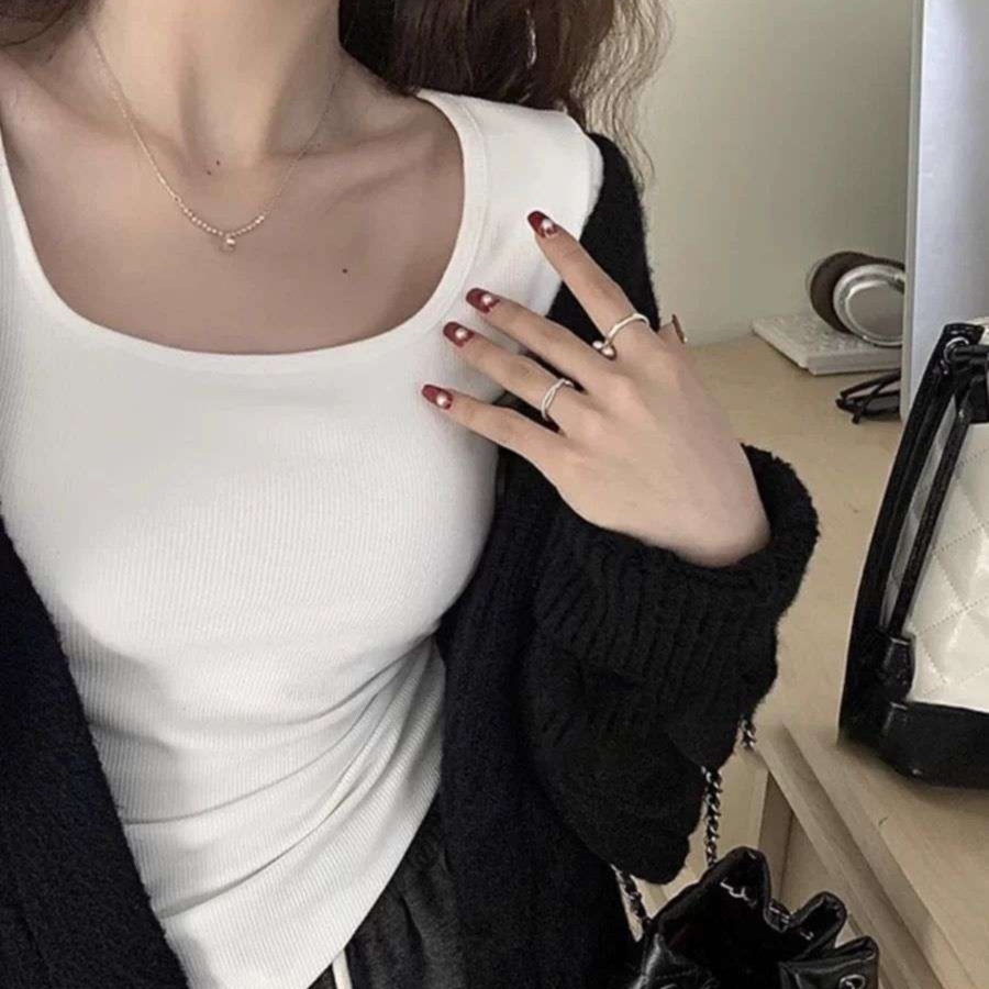 柔らかな肌触りで、スクエアネックがすっきりとした印象を与えます。