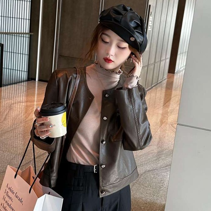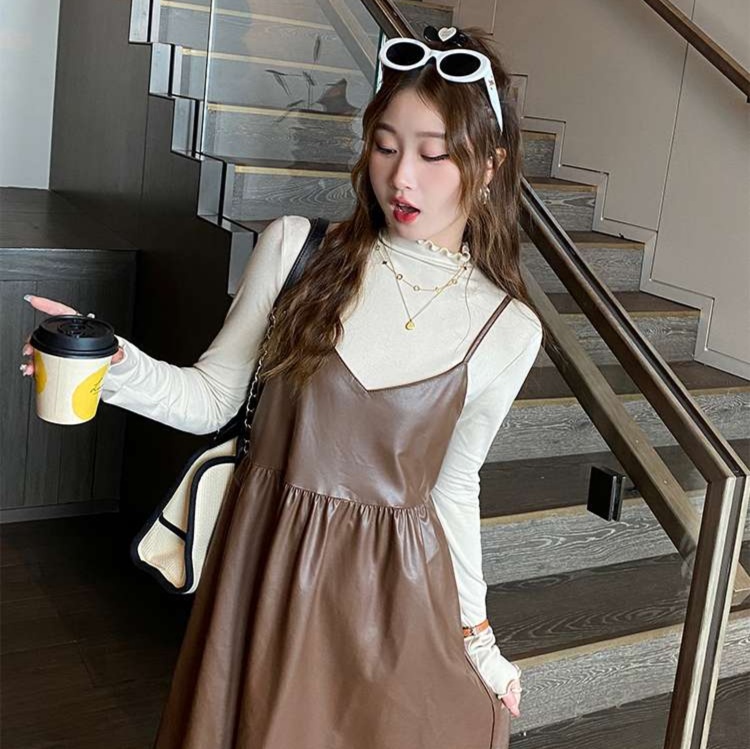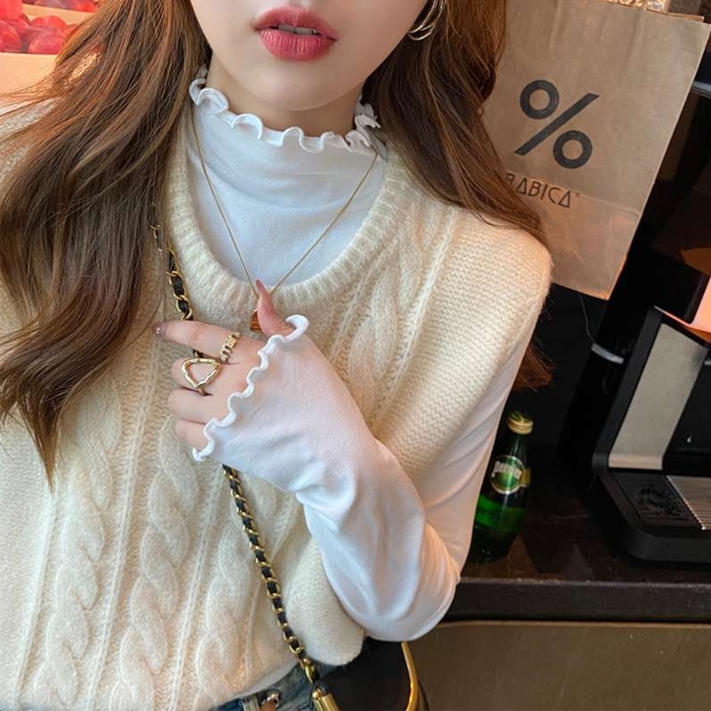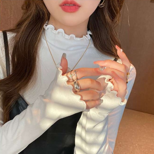 首元のフリルデザインが甘さと上品さを演出し、女性らしい雰囲気を醸し出す