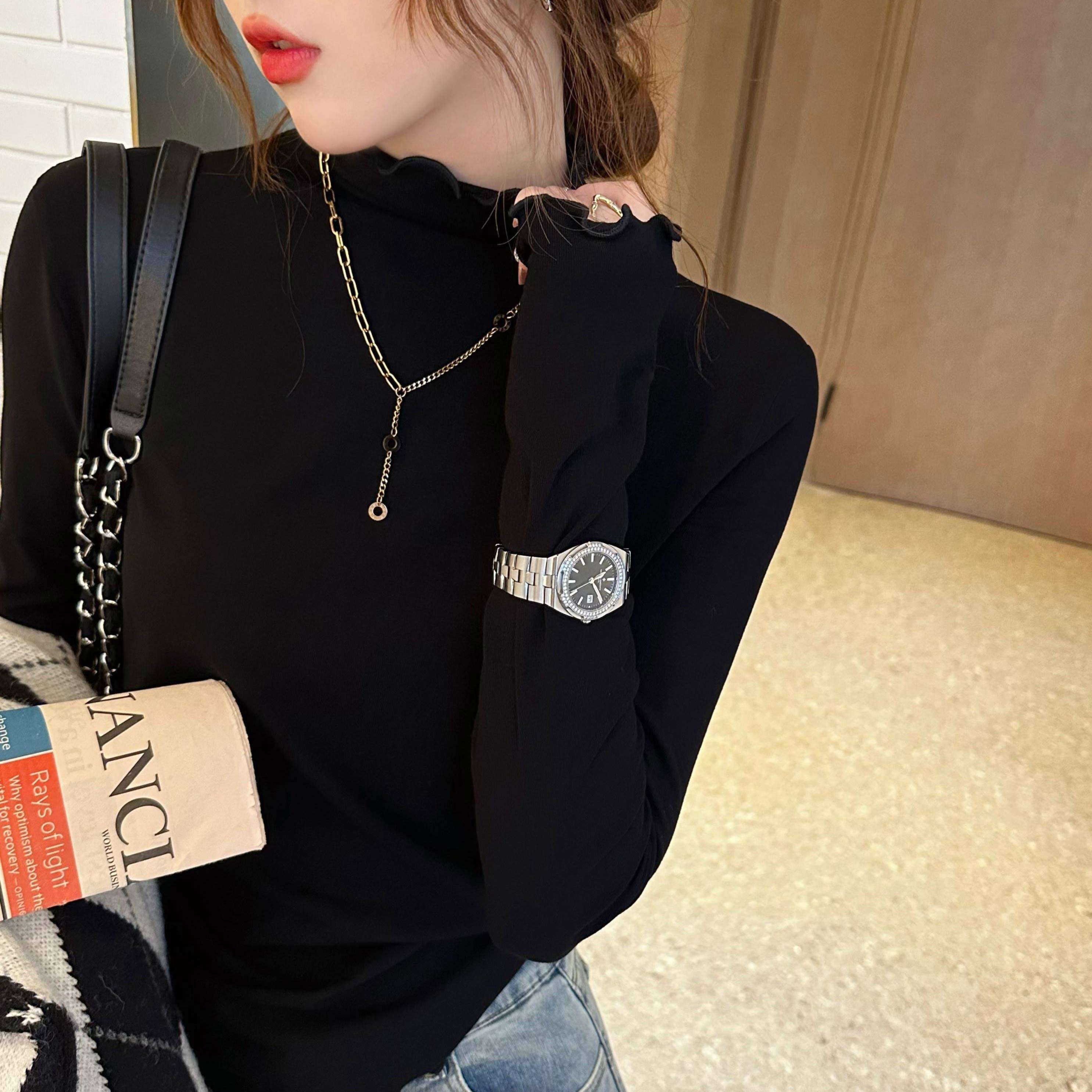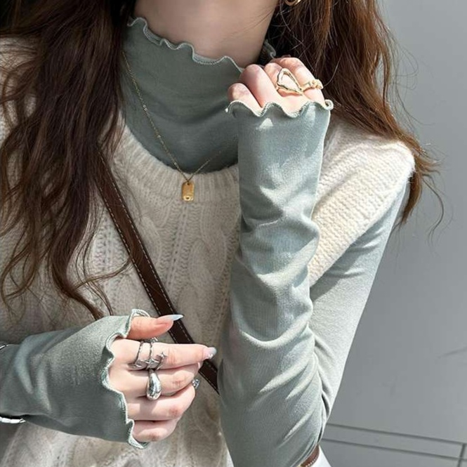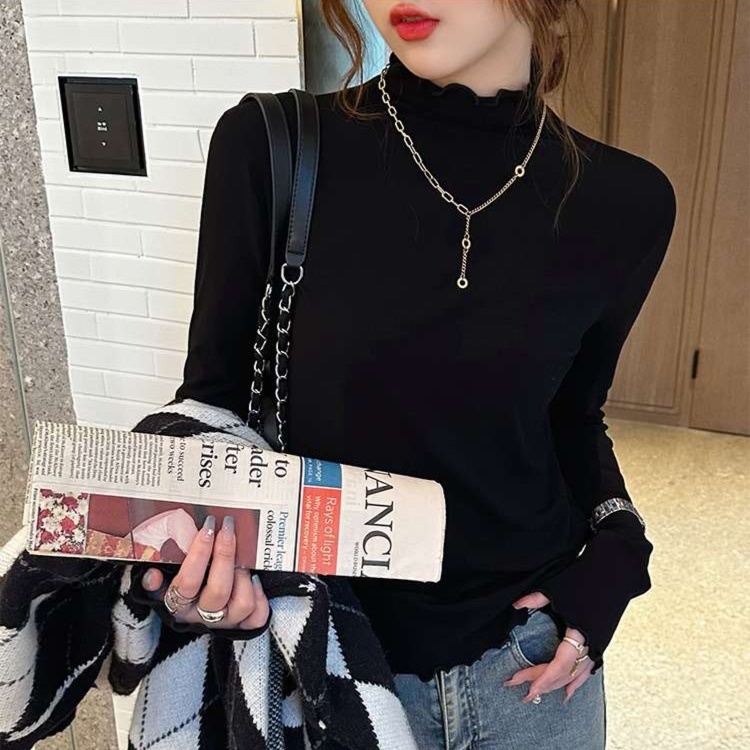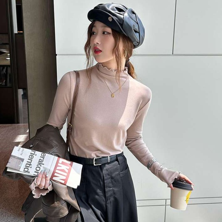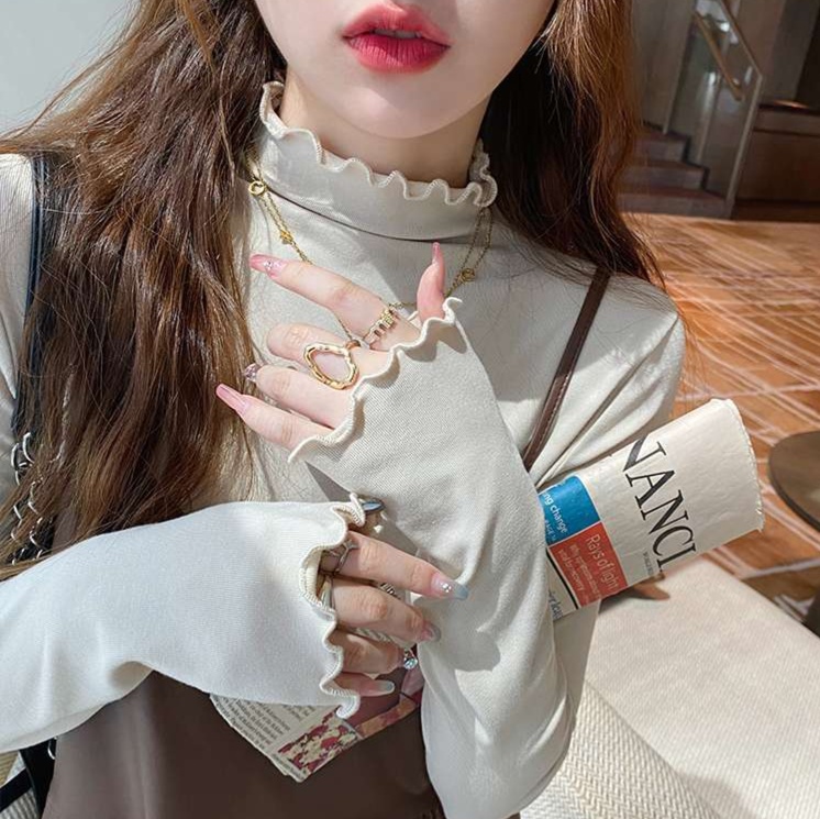 ハイネックデザインで首元をエレガントに見せる長袖トップスです。