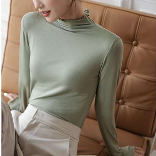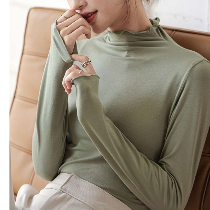 ハイネックデザインが首元を美しく見せ、レイヤードスタイルにも最適な洗練された大人の一枚。