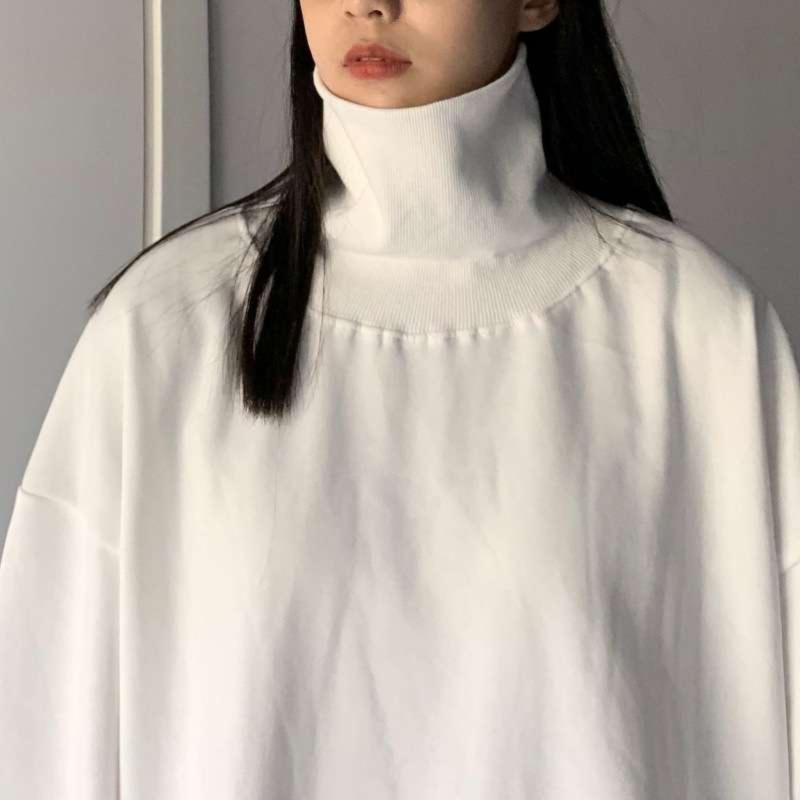 首元をすっきりと見せるハイネックは、モダンでスタイリッシュな印象を演出