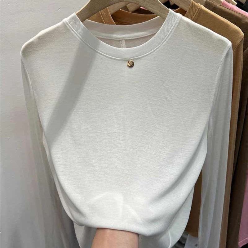 首元の小さな金具がさりげないアクセントになった長袖カットソー。