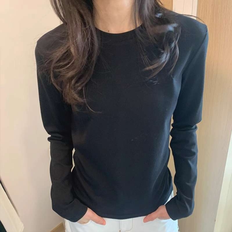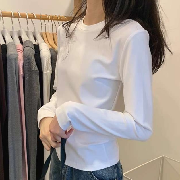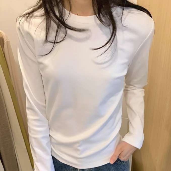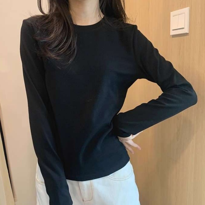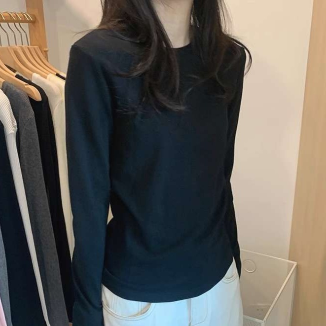 シンプルなデザインのロンT型カットソーは様々なコーディネートに活躍。