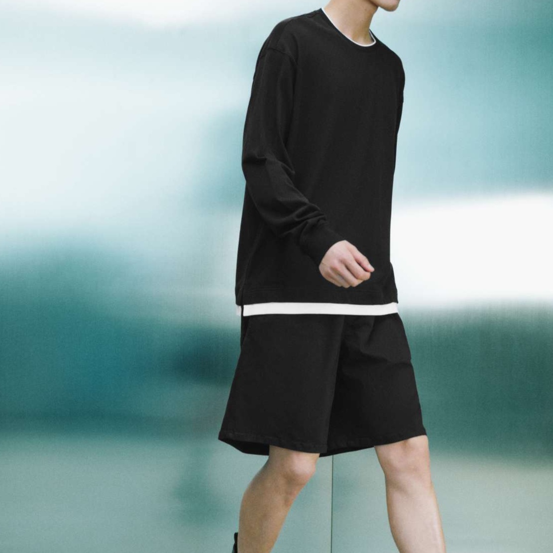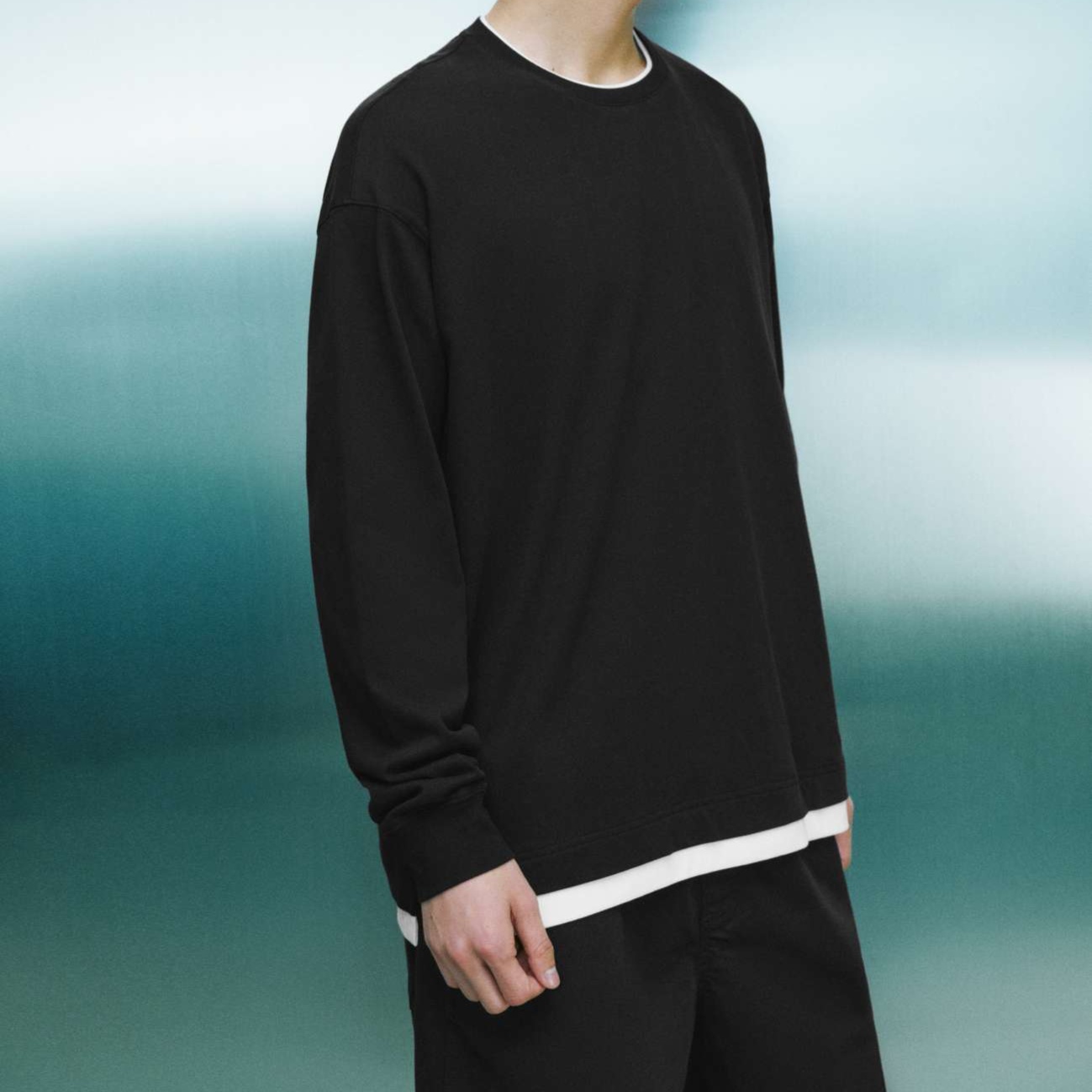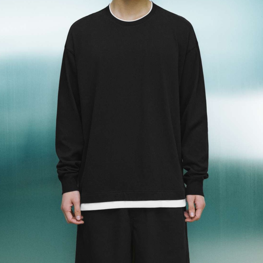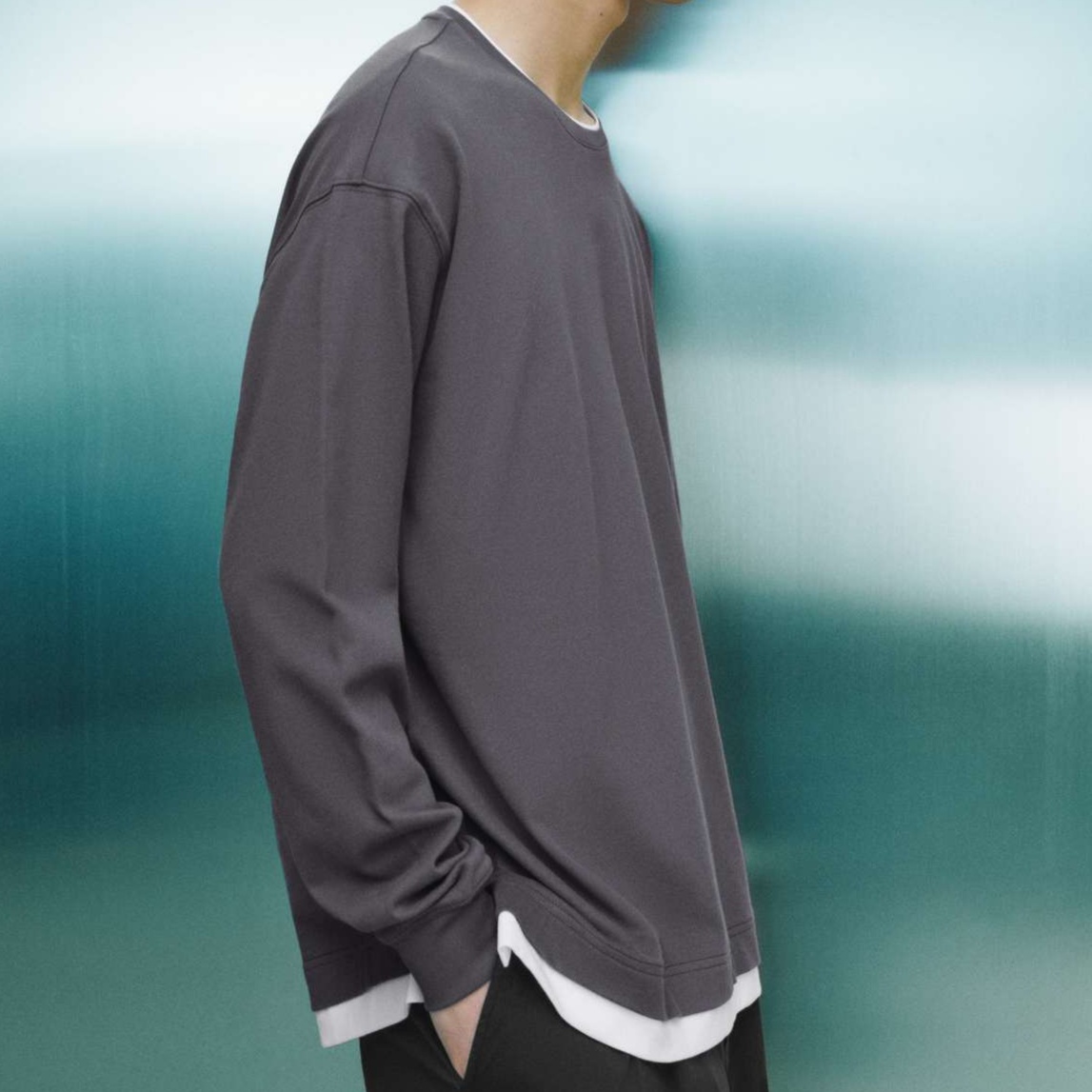 レイヤードスタイルを演出する裾デザインが、シンプルながらもアクセントになる洗練されたロンTに。